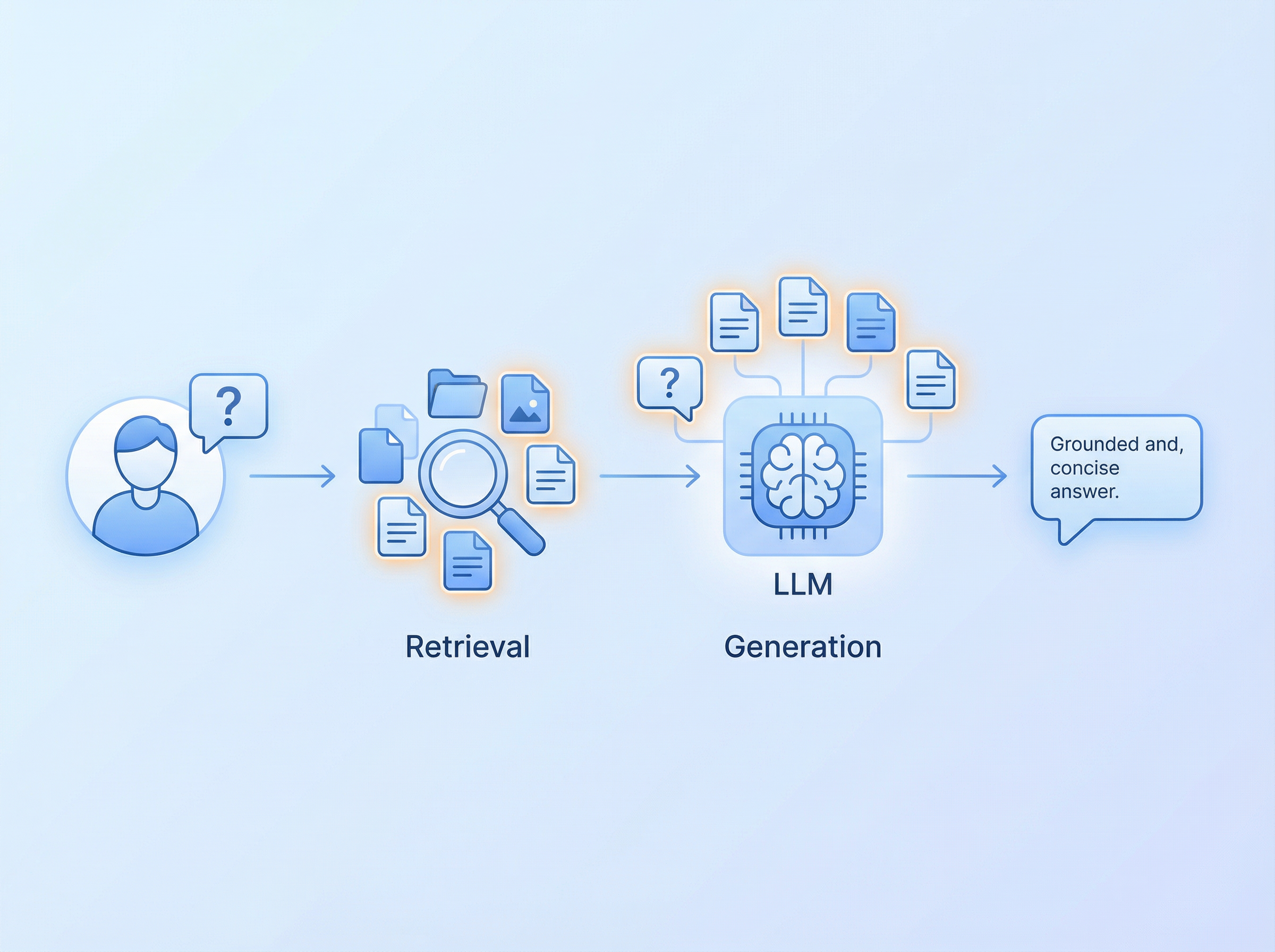 Generate: Those chunks get fed to the LLM alongside the user's question. The model generates an answer grounded in your actual data.