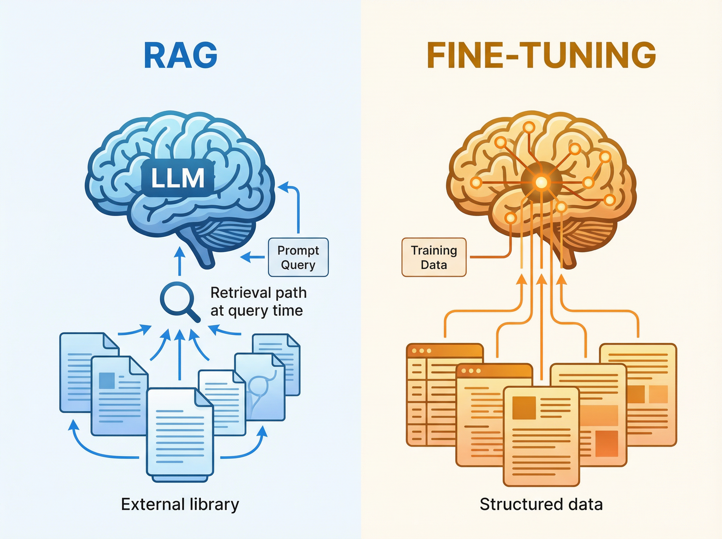 Fine-tuning is a different game. Instead of giving the model new information at query time, you're changing the model itself. You're reshaping its behavior, its reasoning patterns, how it structures responses.