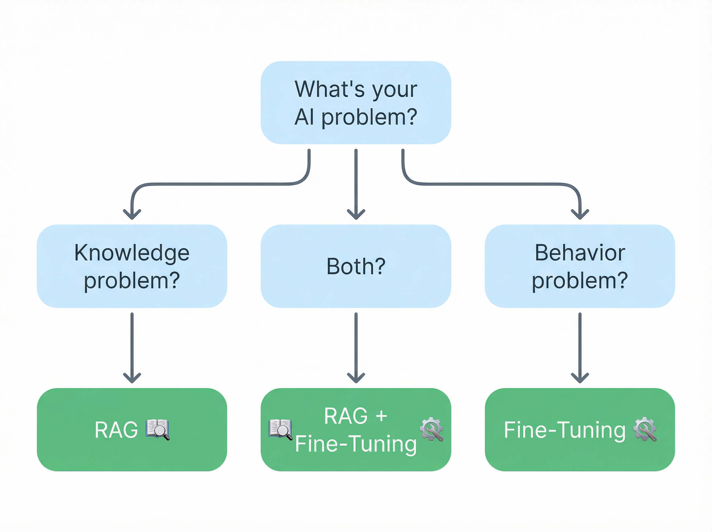 1. Is your problem about knowledge or behavior? Knowledge? RAG. Behavior? Fine-tuning. Both? You already know.